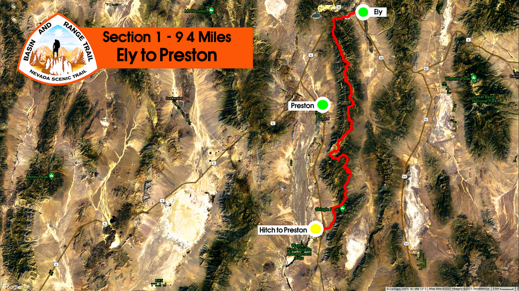 From Ely, the route heads south through the Egan Range, and quickly reaches 10,000ft. Striking limestone cliffs on the west side and a more gentler, rolling east side provide a prompt introduction to the Basin and Range topography that make up much of the state. From the ridgeline of the Egans, sweeping views of Steptoe Valley and White River Valley. This area is surprisingly green and lush, with pockets of pines, aspens and ample water. To stay on the crest and walk the ridge, much bushwhacking is involved. Cave Valley offers a low route alternative to the ridgeline if needed. The section ends at HWY 318 near Sunnyside. From here, it's a 30 mile hitch north to Preston to Resupply.