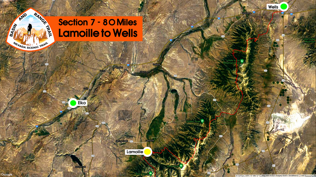 The goal of this section is to make it through the East Humboldt Range to Gray's Peak, where you will cross the divide and drop down to Angel Lake, making the end of the wettest section along this route. Walk into the town of Wells from here to resupply.