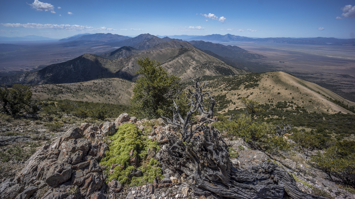 into the Kinsley Range. Walk through a huge open pit gold mine your way up to the crest, and follow that south to Antelope Peak, highpoint of the range. Next comes the Antelope Range, home to not only many pronghorn but also large herds of wild horses. The route then follows the Schell Creek Range south, second longest in Nevada. Summit Becky Peak to gain access to the crest, which offers excellent views. The Schell Creek Range has a decent route that runs along, or parallel to, the crest. It's a mixture of single track trail, and bushwhacking, and a 4x4 trail called the Ranger Trail. Take the high route along the 11,000+ft ridgeline in the High Schells Wilderness to bag some ultra prominent peaks, or a lower route below the crest. This section ends at Cave Lake State Park, where it's a 15 mile hitch into Ely to resupply.